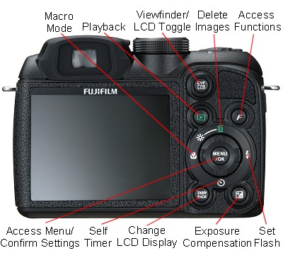 But, to save on battery power, one can switch to a view-finder mode --- as seen in this labelled image of the back of the camera.