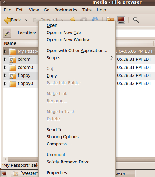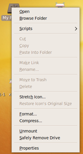 The menu image above is what I saw. It had no 'Format...' option. It would ordinarily appear near the bottom of Gnome2 right-click menus that look like this. I noticed that there was a 'My Passport' icon on my desktop that showed up after connecting the external USB drive to the computer. I right-clicked on that desktop icon, and the following right-click-menu showed up. |