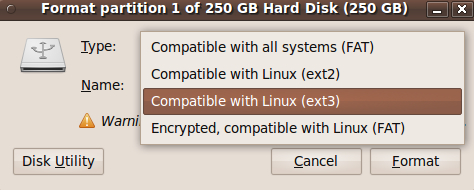 Step 2: (choose file system type & enter a volume ID) From the 'Format' dialog panel that popped up, I chose 'ext3' instead of 'FAT', and I entered a Volume ID of 'WD_250BG_MyPassport'. (A max of 16 characters is accepted, so I ended up with a vol-ID of 'WD_250BG_MyPassp' --- which was OK with me.) |