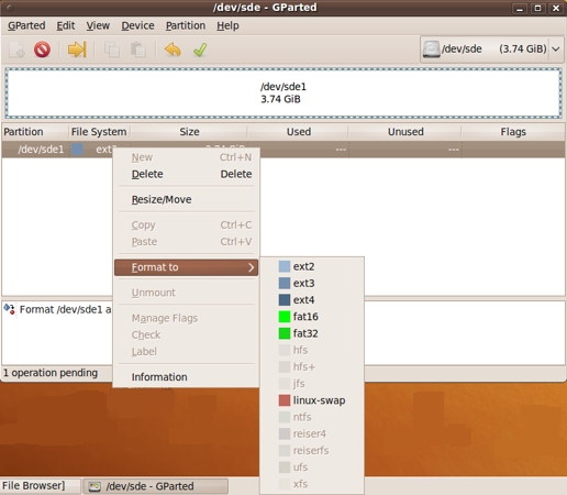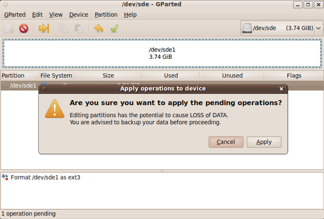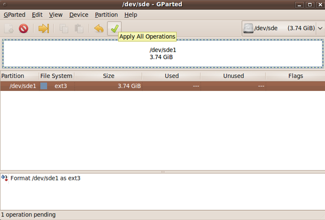 I right-clicked on the '/dev/sde1' line in the middle of the GUI and, from the menu that popped up, I chose 'Format to' and 'ext3'. This put a pending operation at the bottom of the GUI --- 'Format /dev/sde1 as ext3'. In the image below, you can see that the check-mark icon at the top of the GUI is labelled 'Apply All Operations'. I clicked on that to start the formatting. The formatting took about a minute. |