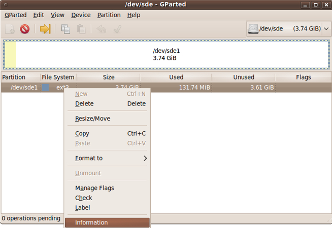 I right-clicked, again, on the /dev/sde line, and chose 'Information' this time, instead of 'Format to', from the popup menu. The menu is seen in the image above. Below is an image of the 'Information' panel that popped up. |