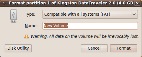 ![]() This is the disk 'Format' dialog window that appears after clicking on the desktop icon of a disk drive --- on the Gnome2 desktop of Ubuntu 9.10. |