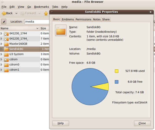 I changed 'Type' from 'FAT' to 'ext3' and entered 'Sandisk8G' for a Volume ID. Then I clicked the Format button, and the format took about 3 minutes to complete. An image of what the Nautilus 'Properties' option showed, after the ext3-formatting was done, is shown below. A Side Note : When I inserted the Sandisk stick in a USB port on my computer, the 'U3 System' desktop icon (seen in the image above) was also created for the Sandisk stick. When I first used a Sandisk stick, on a Microsoft operating system, I found that it had some offensive software (for backups and other stuff) that tried to run automatically when I used the stick, and I could not remove the software. After some web searches, I found that Sandisk puts the software in a separate partition on the USB stick and that partition emulates a CD disk. The 'U3 System' desktop icon represents that second partition of the Sandisk USB stick. I found that Sandisk provides, via one of their web pages, some software that you can download and use to remove the offensive, space-wasting files on the USB stick. BUT the software is not easy to use, because it sometimes does not recognize the USB stick. After several attempts (logoff-logon and/or remove-reinsert USB stick), I was able to get the software to work on one Sandisk stick. I never used the software (written for use on a Microsoft OS only) on this Sandisk stick, so the offensive CD partition and files are still on this stick. Perhaps someday I will find a way to remove the files from this stick, on Linux, but the partition takes only about one-tenth of a Gigabyte, so I leave it for now. When I did the web search on how to remove the Sandisk software, I found many other people did not want the software and were frustrated by the fact that the software was not easily removable by simple means, like drag-to-trash. Some people said they would never buy a Sandisk USB stick again. I too plan to avoid buying Sandisk USB sticks in the future. Unfortunately, I bought three in a package and was stuck with several. I prefer Kingston USB drives, but I have many others, including HP (from BigLots), PNY (from BestBuy), DaneElec (from Target), GigaWare (from RadioShack), Ativa (from OfficeDepot), Verbatim (from OfficeMax), Transcend (from an Internet seller, TigerDirect?), and Toshiba (from Office Max). No more Sandisk --- which I believe I got at Costco, in a package of 3. |