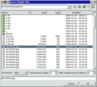 The image below has a larger version. The following are Mark Tyler's words: During 2007 and 2008 I designed and implemented a new file picker for mtPaint. Dmitry then refined my efforts to make the picker even better, with the final results now in version 3.30 of mtPaint: Designing and implementing a new file picker was a big effort but I felt I had no choice due to my increasing frustration with the existing GTK+ file pickers. For a few years I tolerated the Motif style GtkFileSelection, but the time finally came to improve things. I also found that the GtkFileChooser is even worse due to its lack of functionality compared to more orthodox and mainstream file pickers. The general design of the new mtPaint file picker was deliberately conservative as I was looking to preserve the simplicity and ease of use I have seen in programs like OpenOffice, and most Windows/Qt/KDE systems. The picker also has the luxury of tab completions and wildcards. If you type "p" into the entry box and press tab, only files beginning with "p" will be displayed. If you type "dsc*.jpg" into the entry box and press tab, the file list will only display files beginning with "dsc" and ending with ".jpg". As you would expect the * wildcard represents any number of characters and the ? wildcard represents exactly one character. I consider this new design to be far better than the rather feeble GTK+ designs, but some people may prefer the GtkFileSelection dialog, so if that is the case you can re-compile mtPaint with: