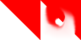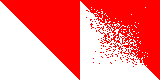 You place a gradient by selecting the gradient placement tool from the toolbar and then you place the beginning and end points by clicking the mouse. Once this has been done you will see a temporary preview of the resulting gradient and you then need to select a painting tool and paint on the canvas. In order to configure the gradient you need to press the right button on the gradient placement icon on the toolbar. Here is an example of a simple linear gradient from red to yellow painted using the polygon tool to create a triangle. The image on the left displays the construction lines for the gradient placement tool and the polygon tool, whereas the image on the right represents the exact pixels on the canvas: