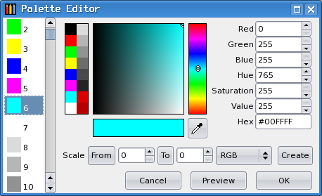 When editing the whole palette, you can create colour scales between two selected colours; set the "From" and "To" spins to the endpoints of the scale, select the interpolation mode, and press the "Create" button. Pressing the "From" and "To" buttons sets the corresponding spin to the current colour index.