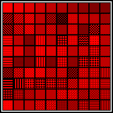 Painting actions normally use a flat colour, but it is possible to use different patterns. To choose a different pattern you can press F2 or click on the pattern preview area just above the palette. You will then be presented with the following patterns which you can choose from: