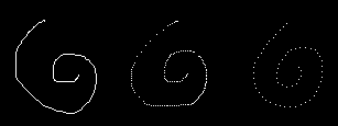 The first line was created using continuous mode. The second line was created using non-continuous mode with a brush space of 0, and the final line was created with a brush space of 5. Varying the non-continuous brush spacing also makes the results of using the spray tool more deterministic, however fast the mouse is moved.