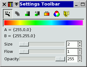 The palette is positioned on the left hand side of the mtPaint window and is used to select colours for painting. If you left click on a colour it is chosen for colour A and a right click will choose colour B. Colour A and B are previewed in a small area above the palette. A and B can be swapped by pressing the 'X' key.