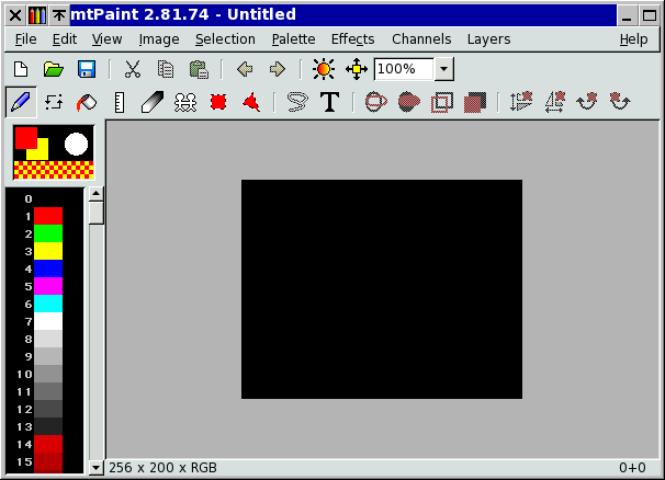 Pixel Art is the main task that mtPaint is designed for. This art form is essentially very simple and similar to painting in the real world. For example you have a canvas to paint on, a brush to paint with, and a palette of colours for the brush to use.