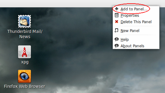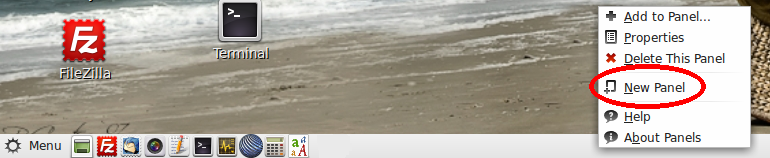 I clicked on the 'New Panel' option in that popup menu. A new 'thin panel' appeared on the screen --- by default, positioned at the top of the screen --- exactly what I wanted. That 'upper panel' was completely blank, so I right-clicked on that upper panel and got the little panel popup menu (again) as seen in the following image. |